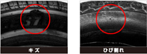 対策タイヤキズ タイヤにキズや、古く劣化してひび割れができていないか、チェックしましょう。